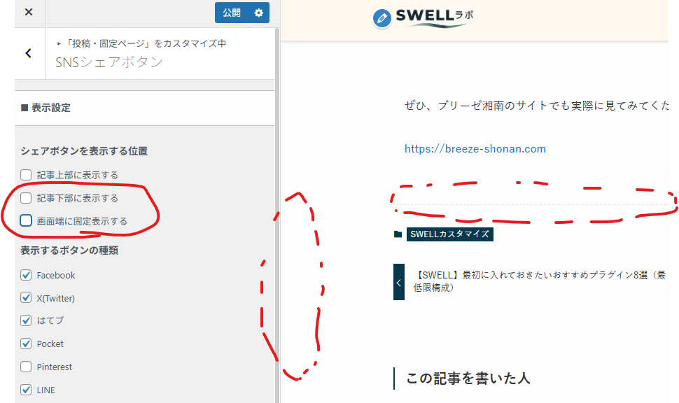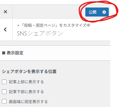 シェアボタンを表示する位置から、「記事下部に表示する」と「画面端に固定表示する」のチェックを外すとすぐに反映されます。